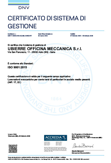 Grazie ad un efficiente Sistema di Gestione Qualità e la Certificazione ISO 9001:2015, rinnovata annualmente, la Ubierre Officina Meccanica Srl garantisce al cliente finale la conformità del prodotto ai requisiti di Qualità concordati e la massima puntualità nelle consegne, oltre al monitoraggio e gestione dei processi produttivi e di collaudo che garantiscono un’elevata affidabilità.